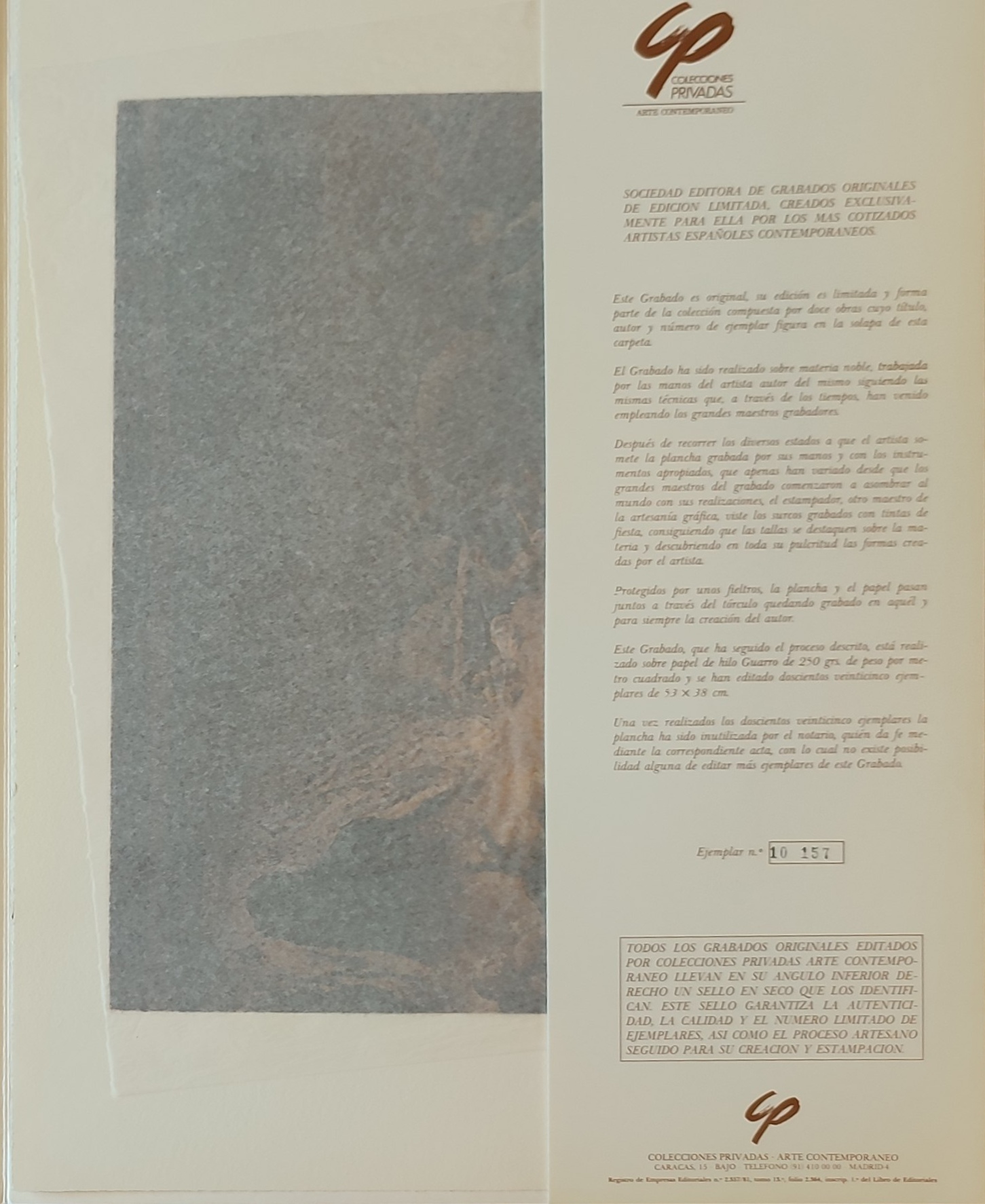Grabado al aguafuerte perteneciente a la Serie de aguafuertes con el tema de la Inquisición. Es el aguafuerte número X, de los XII de los que se compone la serie de Colecciones Privadas de Arte Contemporáneo, en edición limitada.